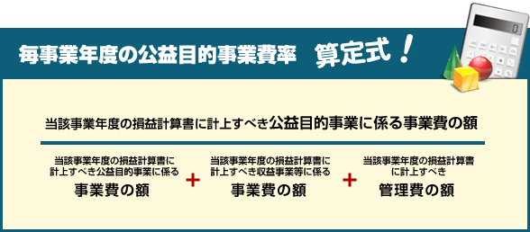 したがって、毎事業年度の公益目的事業費率は、(当該事業年度の損益計算書に計上すべき公益目的事業に係る事業費の額)/{(当該事業年度の損益計算書に計上すべき公益目的事業に係る事業費の額)+(当該事業年度の損益計算書に計上すべき収益事業等に係る事業費の額)+(当該事業年度の損益計算書に計上すべき管理費の額)}という算式で計算され、公益法人は、この比率が50パーセント以上でなくてはならず、公益認定に際しては、この比率が50パーセント以上であると見込まれなければならないとされています。